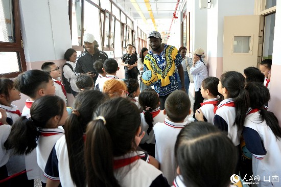 圖為沙杰和午亭小學(xué)的學(xué)生一起玩滾鐵圈。人民網(wǎng) 盧鵬宇攝