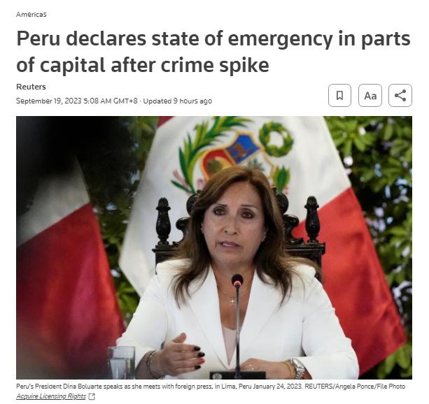 中新網(wǎng)9月19日電 據(jù)路透社報道,當(dāng)?shù)貢r間18日,秘魯總統(tǒng)博盧阿特表示,秘魯政府已宣布首都利馬市三個犯罪率飆升的地區(qū)進入緊急狀態(tài),這一措施允許軍方協(xié)助政府加強地區(qū)安全管控。