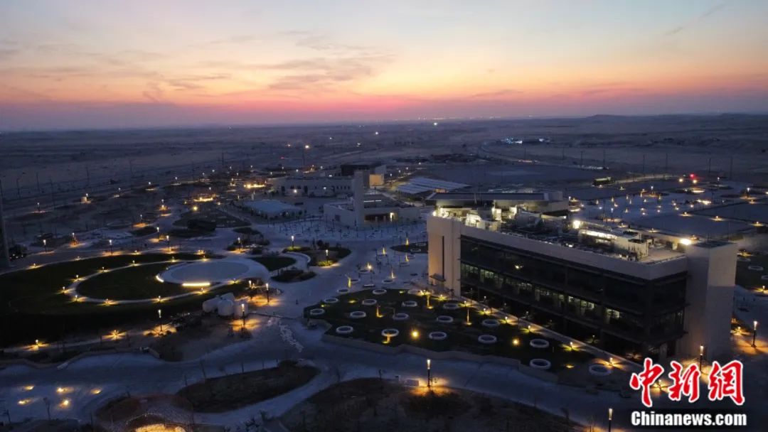 中鐵十八局集團承建的沙特薩拉曼國王能源城項目行政樓、禮堂、醫(yī)院等五棟建筑及附屬工程燈光效果。(2022年11月拍攝)杜林 攝