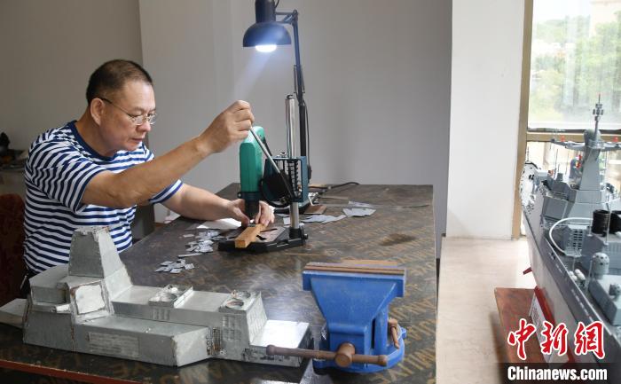 圖為潘雄在制作間里打磨艦船模型配件。漳州市退役軍人事務(wù)局 供圖