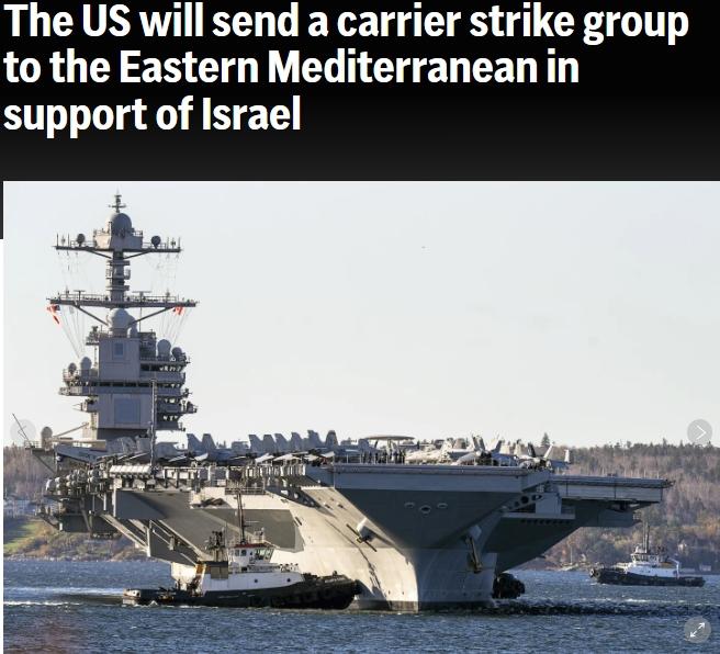據(jù)美聯(lián)社報道,當(dāng)天,美國國防部長奧斯汀發(fā)表聲明稱,他下令“杰拉爾德·R·福特”號航空母艦戰(zhàn)斗群移至更靠近以色列的東地中海,包括一艘航空母艦、一艘導(dǎo)彈巡洋艦和四艘導(dǎo)彈驅(qū)逐艦,以展示武力,準(zhǔn)備應(yīng)對任何情況,這些情況包括阻止更多武器送達巴勒斯坦伊斯蘭抵抗運動(哈馬斯)以及進行監(jiān)視。