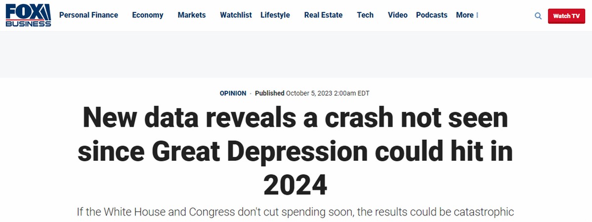 報道中寫道,越來越多的數(shù)據(jù)表明,一場破壞性超過大蕭條的經(jīng)濟崩盤可能即將在2024年降臨美國。白宮和國會如果不盡快削減政府支出,結(jié)果可能是災(zāi)難性的。