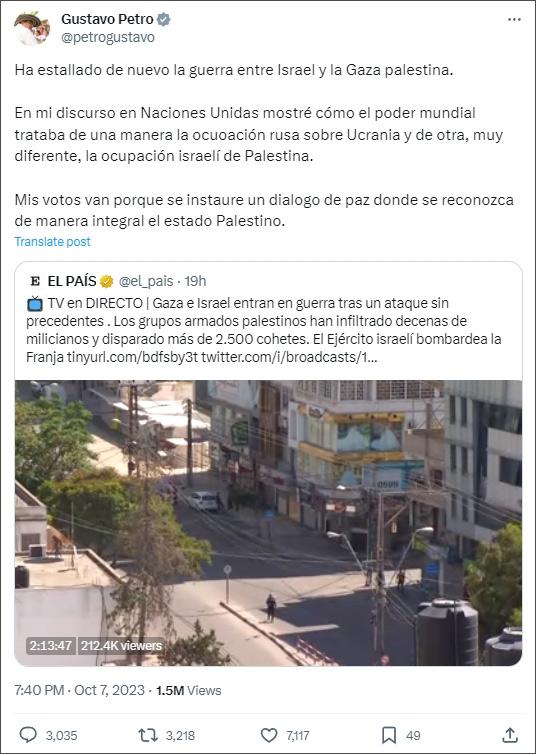 “以色列和巴勒斯坦在加沙地帶再次爆發(fā)戰(zhàn)爭。在聯(lián)合國的演講中,我曾展示了世界大國如何以一種方式對待俄羅斯對烏克蘭的占領(lǐng),但又以另一種截然不同的方式對待以色列對巴勒斯坦的占領(lǐng)。 ”佩特羅在社交媒體X發(fā)文說,“我支持建立和平對話,巴勒斯坦國將得到全面承認?!?/p>