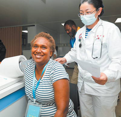 8月21日,中國(guó)海軍“和平方舟”號(hào)醫(yī)院船首次對(duì)所羅門(mén)群島進(jìn)行訪問(wèn)。圖為前來(lái)就診的當(dāng)?shù)孛癖娫卺t(yī)院船上進(jìn)行血壓檢測(cè)。