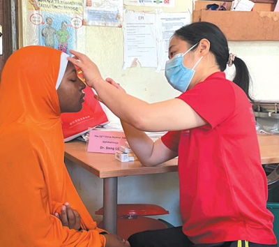 8月27日,中國(guó)(江蘇)第三十二期援桑給巴爾醫(yī)療隊(duì)眼科醫(yī)生董莉莉(右)在坦桑尼亞桑給巴爾島為當(dāng)?shù)鼗颊邫z查。