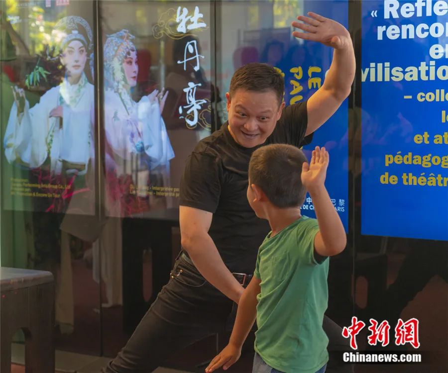 2023年9月赴法演出期間,昆曲走進(jìn)當(dāng)?shù)氐牟┪镳^、大學(xué)校園以及中國(guó)文化中心的工作坊。圖為柯軍帶領(lǐng)當(dāng)?shù)貙W(xué)生體驗(yàn)昆曲扮相??萝?供圖
