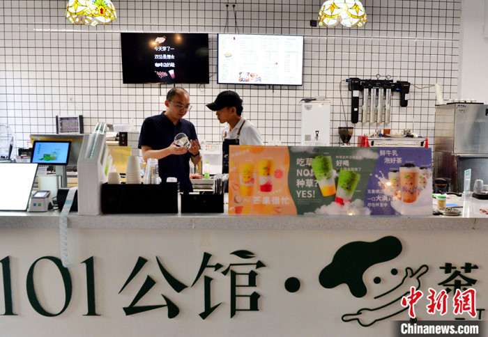 圖為9月19日,曾冠穎(左)在“101公館”內(nèi)的新式茶飲店鋪和店員交流飲品制作。 中新社記者 張斌 攝