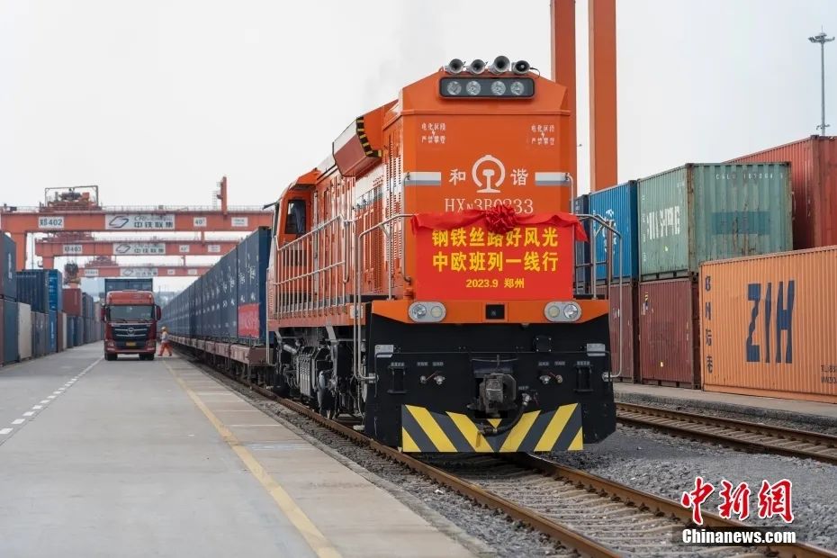 2023年9月17日,河南鄭州,一列滿載醫(yī)療器械、汽車配件等貨物的中歐班列(鄭州)從中國鐵路鄭州局集團(tuán)有限公司圃田車站駛出,將經(jīng)中國二連浩特開往德國漢堡。