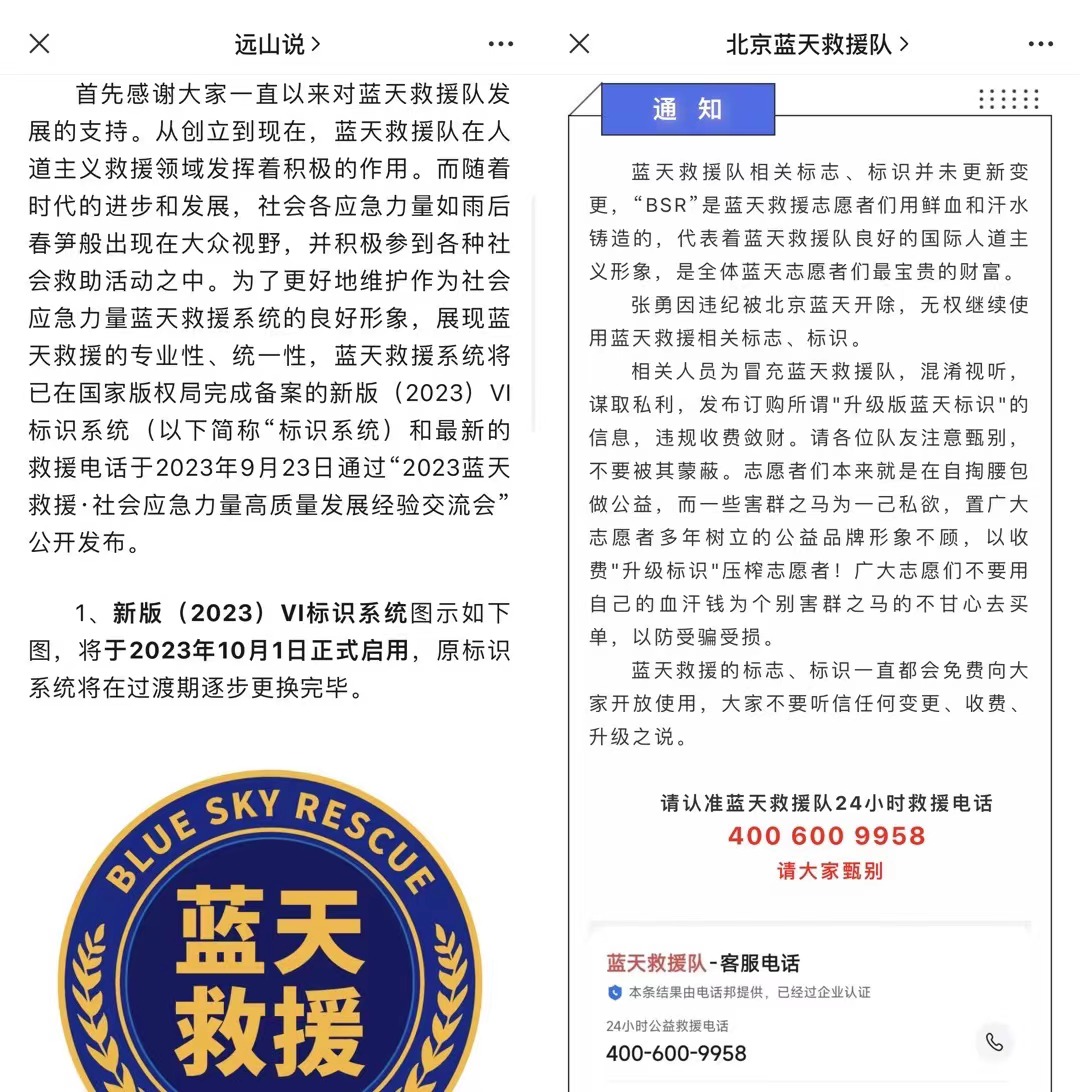中新網(wǎng)注意到,今年9月30日,張勇在“遠(yuǎn)山說(shuō)”公眾號(hào)上發(fā)布了《藍(lán)天救援關(guān)于更換VI標(biāo)識(shí)系統(tǒng)、救援電話(huà)的公告》,稱(chēng)將于2023年10月1日正式啟用。就在啟用當(dāng)天,北京藍(lán)天救援隊(duì)公眾號(hào)發(fā)布信息稱(chēng)“藍(lán)天救援隊(duì)相關(guān)標(biāo)志、標(biāo)識(shí)并未更新變更。不要聽(tīng)信任何變更、收費(fèi)、升級(jí)之說(shuō)。”