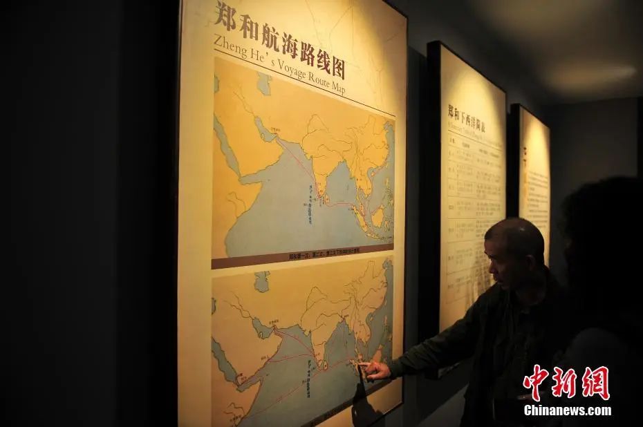 圖為觀眾在鄭和紀念館內觀看鄭和航海線路圖。中新社記者 劉冉陽 攝