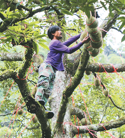 猜瓦家的果園在山坳里,記者乘車從春蓬府直轄縣駛出30公里后,從省際公路拐入狹窄的山間道路,行駛半個(gè)小時(shí)后才來到果園,一大片榴蓮樹分布在斜坡上?!傲裆徬菜荒蜐?,所以斜坡上最好,這里距離海邊不遠(yuǎn),保證了濕潤(rùn)的氣候,山里的土壤營(yíng)養(yǎng)成分高,所以種植的榴蓮肉質(zhì)上乘?!辈峦吲d致勃勃地介紹起自家的果園。