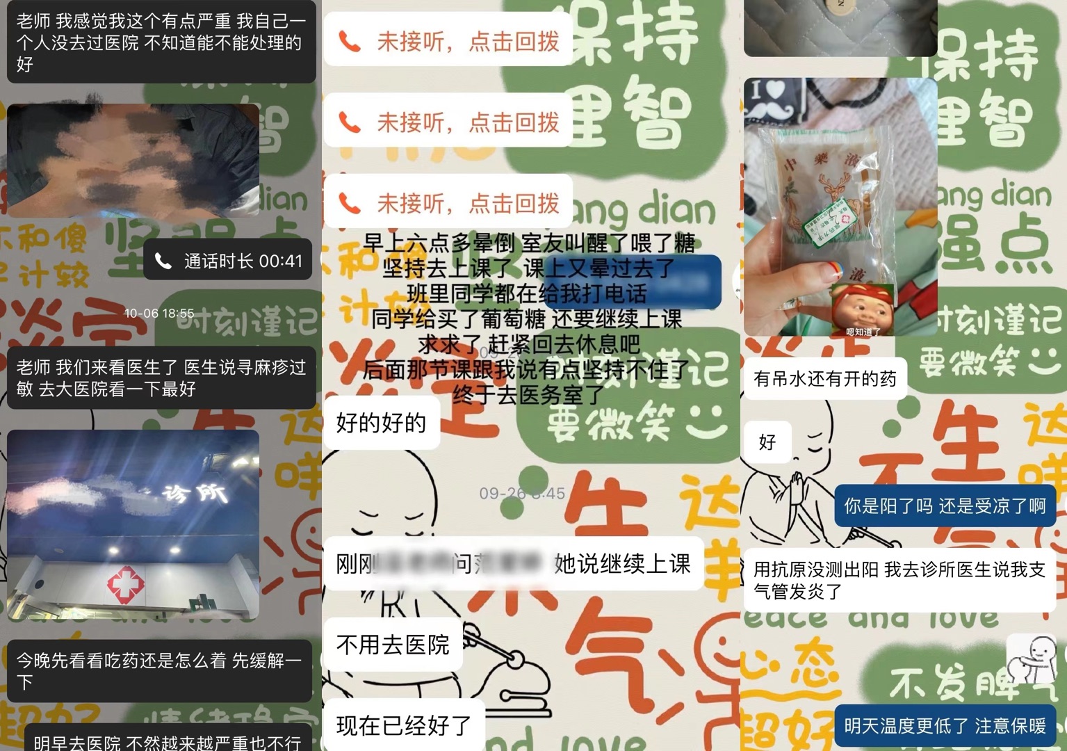 “因?yàn)槲規(guī)У膶W(xué)生基數(shù)較大,三百多人,每周基本上都會(huì)有十幾個(gè)因生病請(qǐng)假的學(xué)生?!?阿宛向中新網(wǎng)介紹,生病的學(xué)生中,最常見(jiàn)的是感冒發(fā)燒、胃疼等情況,也有一些突發(fā)狀況,比如“著急下樓收衣服結(jié)果被垃圾車刮到,半夜嘔吐到進(jìn)醫(yī)院,低血糖在課上暈倒”等。
