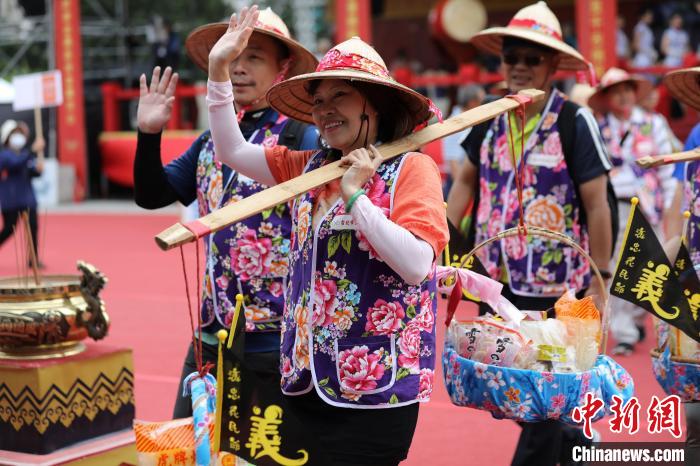 10月22日,臺北客家義民嘉年華主祭大典在臺北舉辦。圖為客家鄉(xiāng)親擔(dān)挑參與活動。 中新社記者 陳小愿 攝