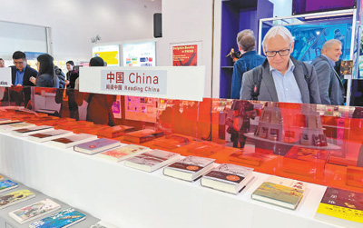 在中國聯(lián)合展臺,《習(xí)近平著作選讀》第一卷、第二卷,《習(xí)近平談治國理政》第一至四卷多語種版和“足跡”系列圖書等被擺放在中心位置,吸引大批讀者閱覽。
