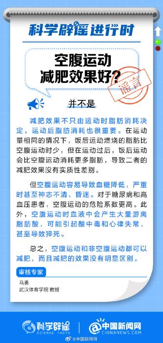 中新網(wǎng)10月24日電 空腹運動和非空腹運動都可以減肥,且減肥的效果沒有明顯區(qū)別。但空腹運動容易導(dǎo)致血糖降低,嚴重時會造成神志不清、昏迷。對于糖尿病和高血壓患者,空腹運動的危險系數(shù)更高。此外,空腹運動時血液中會產(chǎn)生大量游離脂肪酸,可能引起酸中毒和心律失常,甚至導(dǎo)致猝死。(來源:@科學(xué)辟謠 @中國新聞網(wǎng) )