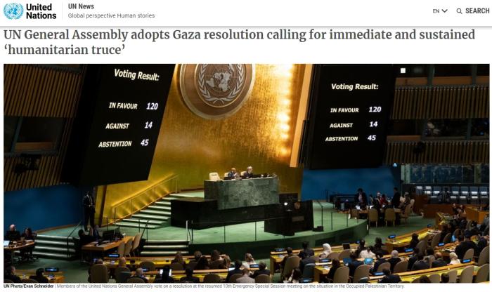 據(jù)聯(lián)合國網(wǎng)站消息,紐約當(dāng)?shù)貢r(shí)間27日下午,第78屆聯(lián)大以125票贊成、14票反對和45票棄權(quán)的表決結(jié)果,通過了由約旦代表阿拉伯國家集團(tuán)提交的一份聯(lián)大決議草案。