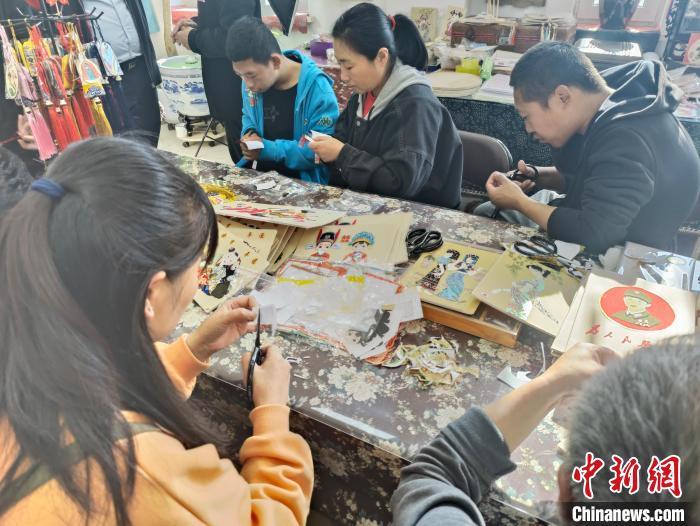 在撫順市非物質(zhì)文化遺產(chǎn)布貼畫(huà)助殘培訓(xùn)基地,殘疾人制作布貼畫(huà)。王晨 攝