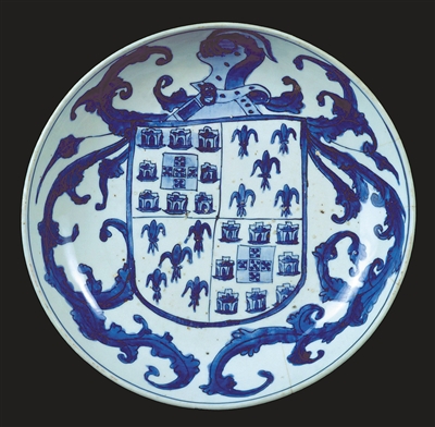 與此同時,葡萄牙貴族開始向中國專門定制紋章瓷器。據(jù)博物館陶瓷收藏館館長拉斐爾·阿爾費寧介紹,定制瓷器在葡萄牙的最早記載出現(xiàn)于1528年,即明代嘉靖年間。葡萄牙人非常珍視這些中國瓷器,甚至在返程途中給它們加飾銀制配件。由于當時歐洲人多使用質(zhì)地粗糙的石制或陶制用具,設計獨特、淡雅脫俗且白皙光潔、能耐高溫的中國瓷器脫穎而出,備受珍視。當時,葡萄牙貴族多以中國瓷器為地位的象征,定制瓷器一時間蔚然成風。其中,由葡萄牙阿爾布克爾克家族定制的瓷盤尤具代表性:盤心繪有盾形紋章,配以十字形盾牌和百合花,藍白相間,光潔細膩。這件瓷器珍品既是歐洲藝術(shù)史上的美麗篇章,亦是中葡藝術(shù)交融出的靈感結(jié)晶。