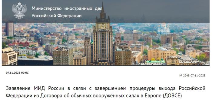 當?shù)貢r間11月7日,俄羅斯外交部發(fā)布關于俄羅斯完成退出《歐洲常規(guī)武裝力量條約》程序的聲明。圖片來源:俄羅斯外交部網(wǎng)站