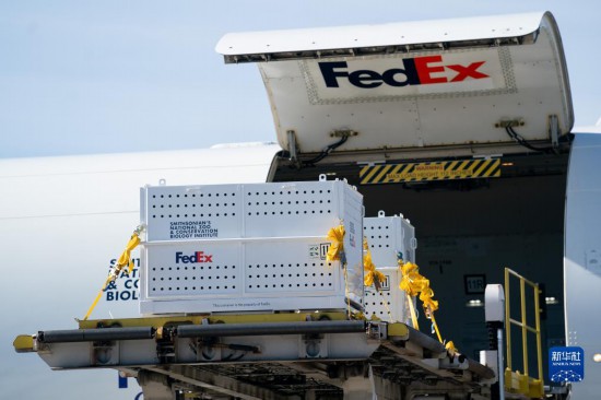 11月8日,在美國(guó)弗吉尼亞州的華盛頓杜勒斯國(guó)際機(jī)場(chǎng),裝有大熊貓的特制“旅行包廂”準(zhǔn)備運(yùn)上專機(jī)。新華社記者劉杰攝