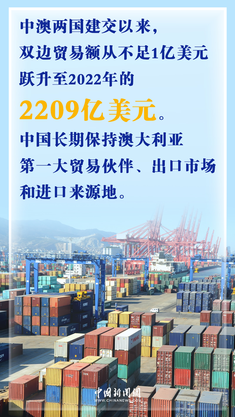 據(jù)中國駐澳大利亞大使館網(wǎng)站數(shù)據(jù),中澳兩國建交50年來,雙邊貿(mào)易額從當(dāng)時(shí)不足1億美元,躍升至2022年的2209億美元。中國長期保持澳大利亞第一大貿(mào)易伙伴、出口市場和進(jìn)口來源地的地位。與此同時(shí),越來越多的澳大利亞優(yōu)質(zhì)農(nóng)產(chǎn)品走進(jìn)中國家庭,豐富了中國消費(fèi)者的選擇。