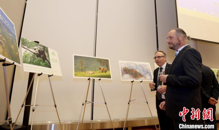 當(dāng)?shù)貢r(shí)間11月8日,中國(guó)駐加拿大使館舉辦國(guó)家公園圖片展暨招待會(huì)。圖為與會(huì)嘉賓觀看大熊貓國(guó)家公園照片。中新社記者 余瑞冬 攝
