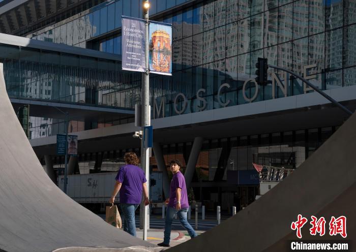 當?shù)貢r間11月7日,民眾從舊金山莫斯康中心附近經(jīng)過?!≈行律缬浾? 劉關關 攝