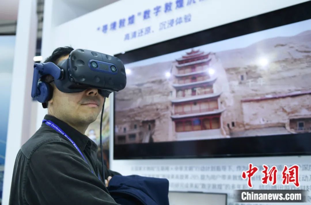 2023年世界互聯網大會“互聯網之光”博覽會上,一位參觀者使用VR眼鏡體驗數字敦煌。王剛 攝