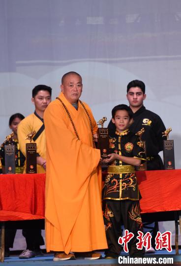 當(dāng)?shù)貢r(shí)間11月12日下午,由中國嵩山少林寺主辦的“不朽少林”少林功夫公演在已有逾百年歷史的美國洛杉磯Million Dollar劇院舉行。圖為嵩山少林寺方丈釋永信向“北美洲少林考功大賽”獲獎(jiǎng)?wù)哳C獎(jiǎng)。 中新社記者 張朔 攝