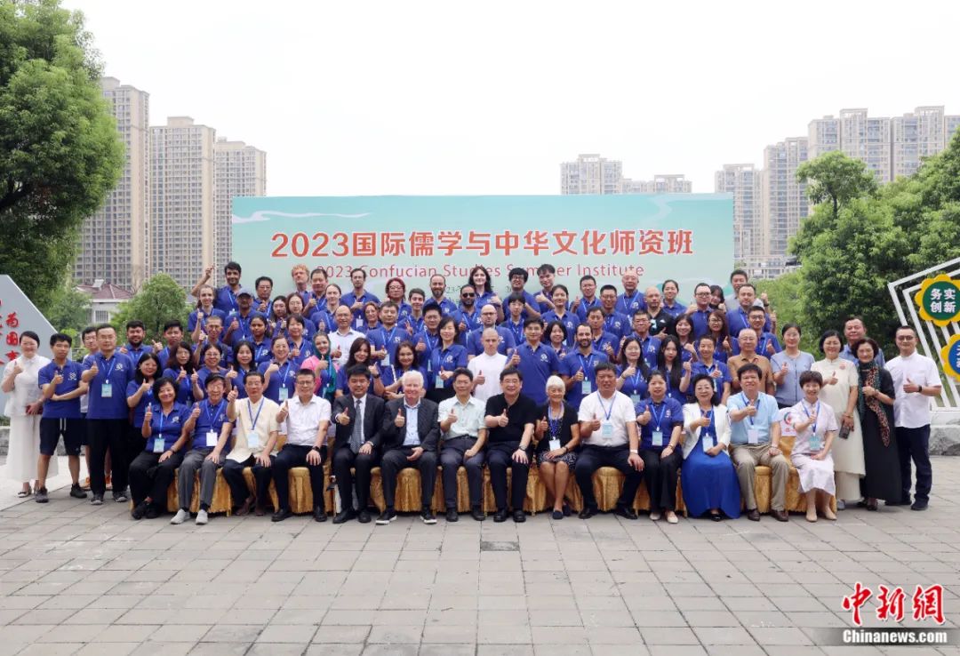 2023年8月14日,與會嘉賓和學院在活動現(xiàn)場合影。當日,由北京外國語大學與國際儒學聯(lián)合會聯(lián)合主辦的“2023國際儒學與中華文化師資班”開班儀式在江蘇省丹陽市舉行,來自20多個國家和地區(qū)的120名學員,參加為期13天的中華傳統(tǒng)文化研修。李國慶 攝