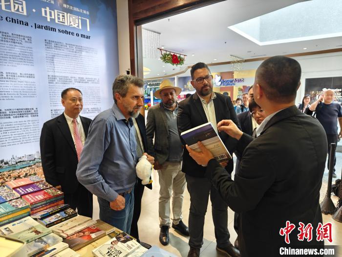 廈門外圖集團(tuán)有限公司工作人員向巴西伊瓜蘇議長莫拉雷斯(右二)介紹中文書籍。廈門市宣傳部供圖