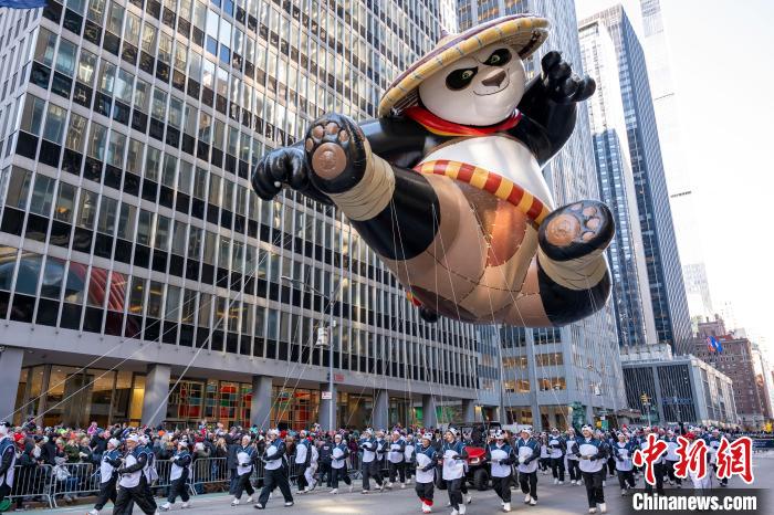 當(dāng)?shù)貢r(shí)間11月23日,第97屆梅西百貨感恩節(jié)大游行在美國紐約曼哈頓舉行。圖為基于動(dòng)畫電影《功夫熊貓》里阿寶的造型設(shè)計(jì)的巨型氣球行進(jìn)在曼哈頓街頭。 中新社記者 王帆 攝