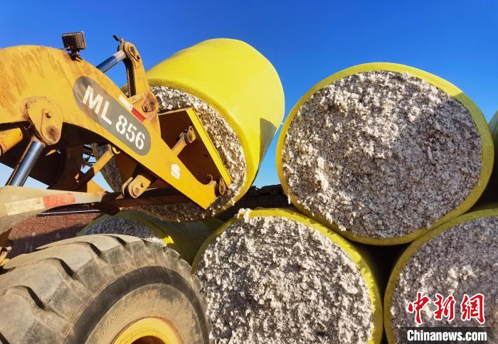 一個個滾圓的籽棉包被卸到分類指定場地。曹慶峰 攝