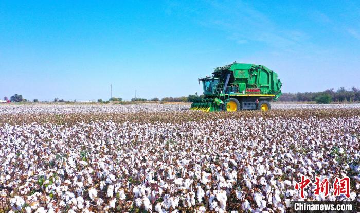 9月23日,在第六師103團蔡家湖鎮(zhèn)一片靠近沙漠邊緣的棉田里,采棉機正采收棉花。(資料圖)李華北 攝