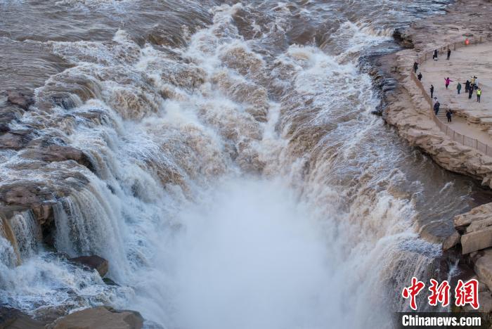 初冬時(shí)節(jié),壺口瀑布水色褪黃轉(zhuǎn)清,從“濁浪翻滾”變?yōu)椤鞍桌颂咸臁?。滔滔黃河水湍流噴瀉,直落龍槽,激起層層浪花,白霧躍然升騰。其聲、其勢(shì)、其景,壯、秀、奇,使人陶醉其間。