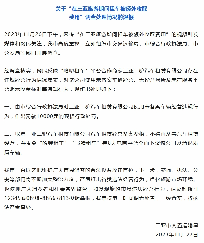 經調查核實,網民反映“哈啰租車”平臺合作商家三亞二驢汽車租賃有限公司存在違規(guī)經營行為情況屬實,對該公司使用未備案車輛經營、無經營場所及未在服務平臺明示收費標準等違規(guī)行為,現(xiàn)作出處理如下:
