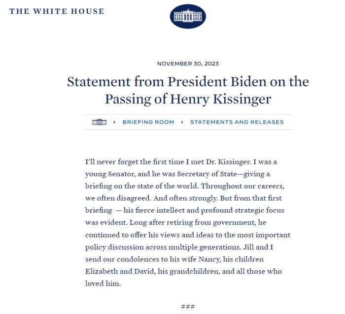 中新網(wǎng)12月1日電 綜合報(bào)道,美國(guó)前國(guó)務(wù)卿基辛格于當(dāng)?shù)貢r(shí)間11月29日去世,享年100歲。當(dāng)?shù)貢r(shí)間11月30日,美國(guó)白宮網(wǎng)站發(fā)布了拜登的哀悼聲明。