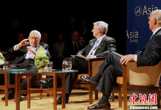 資料圖:美國(guó)前國(guó)務(wù)卿亨利·基辛格(左)與前國(guó)務(wù)卿詹姆斯·貝克等人進(jìn)行有關(guān)美中關(guān)系的對(duì)話(huà)。中新社發(fā) 王歡 攝