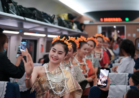 4月13日,老撾工作人員在中老鐵路上開行的D887次國際旅客列車上表演。(新華社記者邢廣利攝)