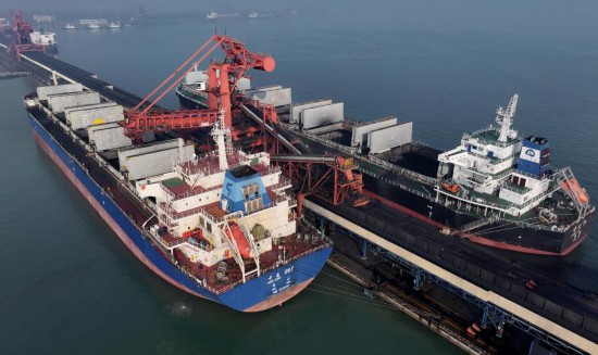 12月5日,兩艘輪船靠泊在唐山港曹妃甸港區(qū)國(guó)投曹妃甸港口有限公司煤炭碼頭裝貨(無(wú)人機(jī)照片)。新華社記者楊世堯攝