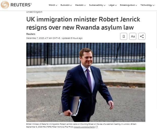 報(bào)道稱,詹里克對(duì)英國(guó)政府當(dāng)日公布的“盧旺達(dá)安全(庇護(hù)和移民)法案草案”持有不同意見(jiàn)。他在一封辭職信中表示,該立法是在2024年英國(guó)大選之前解決移民危機(jī)的“最后機(jī)會(huì)之一”。