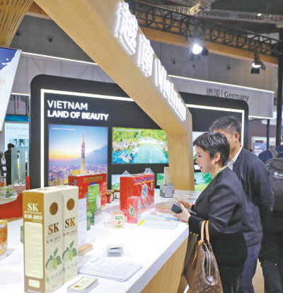 11月6日,參觀者在第六屆進(jìn)博會(huì)國(guó)家展越南展臺(tái)挑選商品。