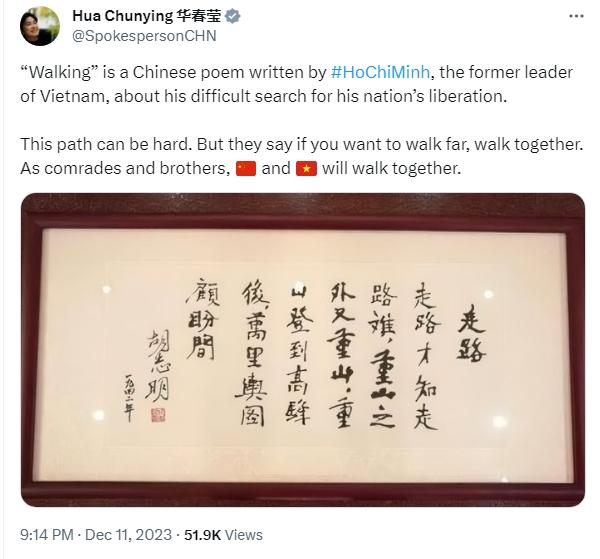 華春瑩寫道,“《走路》是越南老一輩領導人胡志明所寫的一首漢語詩,講述了他爭取國家解放的艱難歷程。這條路可能很艱難。但人們說,如果想走得遠,就要一起走。作為同志和兄弟,中國和越南將一路同行?!?/p>