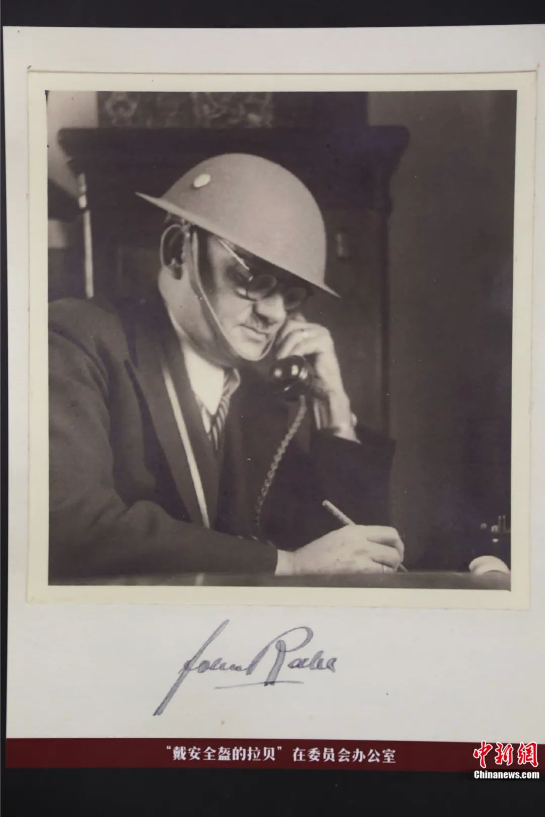 約翰·拉貝北京交流中心展覽上,約翰·拉貝在南京安全委員會辦公的資料圖。袁理 攝