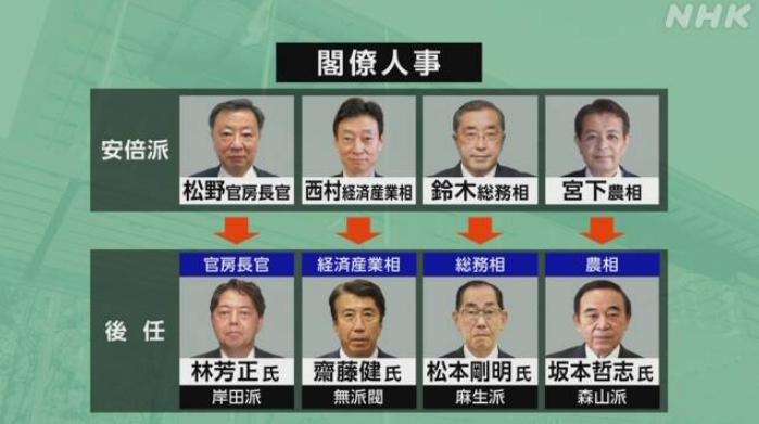 據(jù)報道,岸田將會把官房長官、經產相、總務相和農相四個重要職位換人,此前任外相的林芳正將接替松野博一擔任官房長官,經產相、總務相和農相將分別由齋藤健、松本剛明和坂本哲志擔任。四人均不屬于安倍派成員。