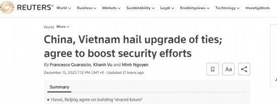 路透社12月13日?qǐng)?bào)道稱,中國和越南宣布,兩國簽署了數(shù)十項(xiàng)合作協(xié)議,同意加強(qiáng)安全事務(wù)合作,共同構(gòu)建“命運(yùn)共同體”。