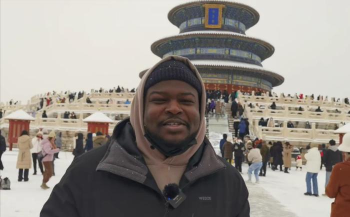 當(dāng)日正值大雪,銀裝素裹的天壇宛如一幅畫(huà)卷,古老的祈年殿在白雪的映襯下更顯莊重肅穆。留學(xué)生們沉浸在大雪紛飛的美景中,紛紛拿出手機(jī)互相打卡拍照,記錄下這美好瞬間。哈薩克斯坦籍留學(xué)生阿迪力(ARYSTAN ADIL)向記者介紹,這是他第一次來(lái)到天壇,“天壇是古代皇帝祭天祈雨的地方,我對(duì)中國(guó)的歷史很感興趣?!卑⒌狭φf(shuō)。