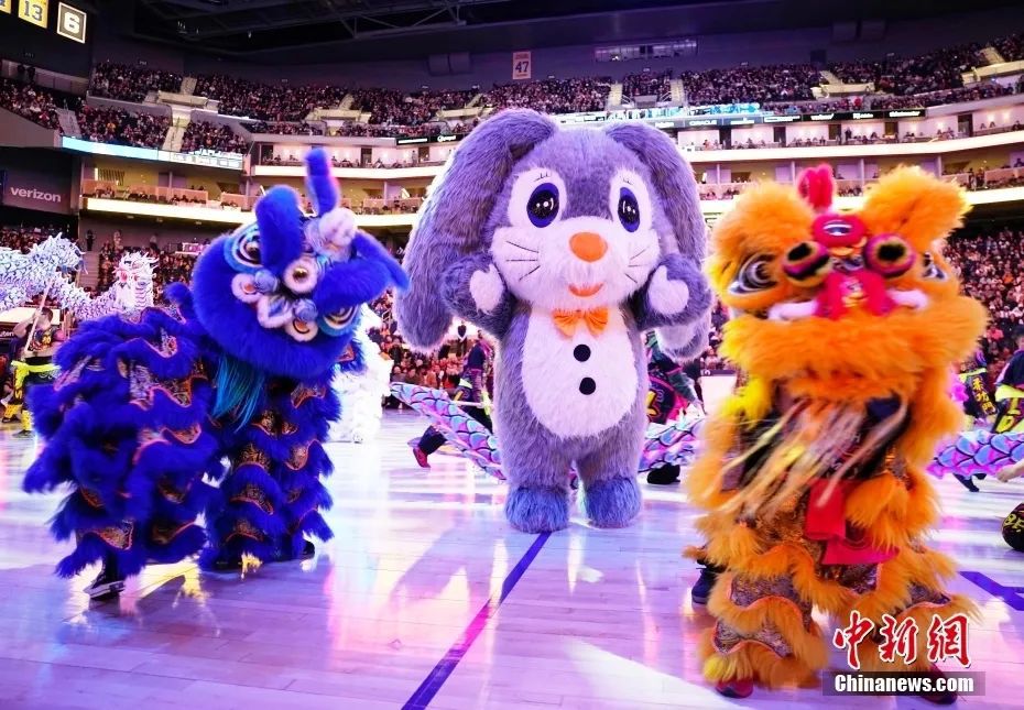 資料圖:當?shù)貢r間1月22日,中國農(nóng)歷新年正月初一晚,美職籃(NBA)金州勇士隊在主場迎戰(zhàn)布魯克林籃網(wǎng)隊的比賽中,按照多年的傳統(tǒng)慶祝中國農(nóng)歷新年的到來。圖為兔子人偶出現(xiàn)在舞龍舞獅表演中。中新社記者 劉關(guān)關(guān) 攝