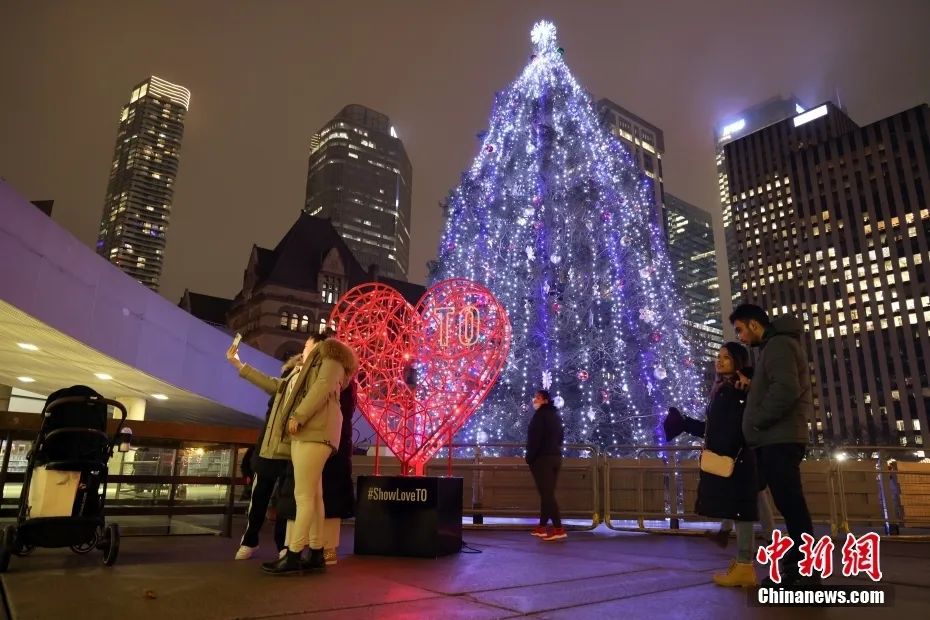 資料圖:當?shù)貢r間2021年12月24日,圣誕平安夜,加拿大多倫多市政廳廣場的圣誕樹與愛心造型的彩燈吸引民眾駐足留影。中新社記者 余瑞冬 攝