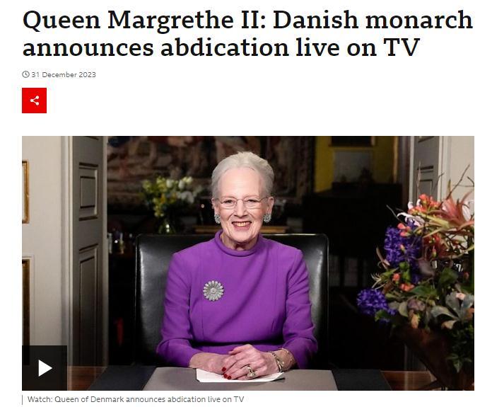 中新網(wǎng)1月1日電 綜合外媒報(bào)道,當(dāng)?shù)貢r(shí)間2023年12月31日,現(xiàn)年83歲的丹麥女王瑪格麗特二世在發(fā)表新年致辭時(shí)宣布,2024年1月14日是她登基52周年紀(jì)念日,屆時(shí)她將退位,把王位傳給其兒子腓特烈王儲(chǔ)。